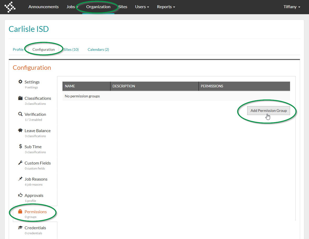1. To add a new Permission Group, navigate to Organization > Configuration > Permissions and click Add Permission Group.