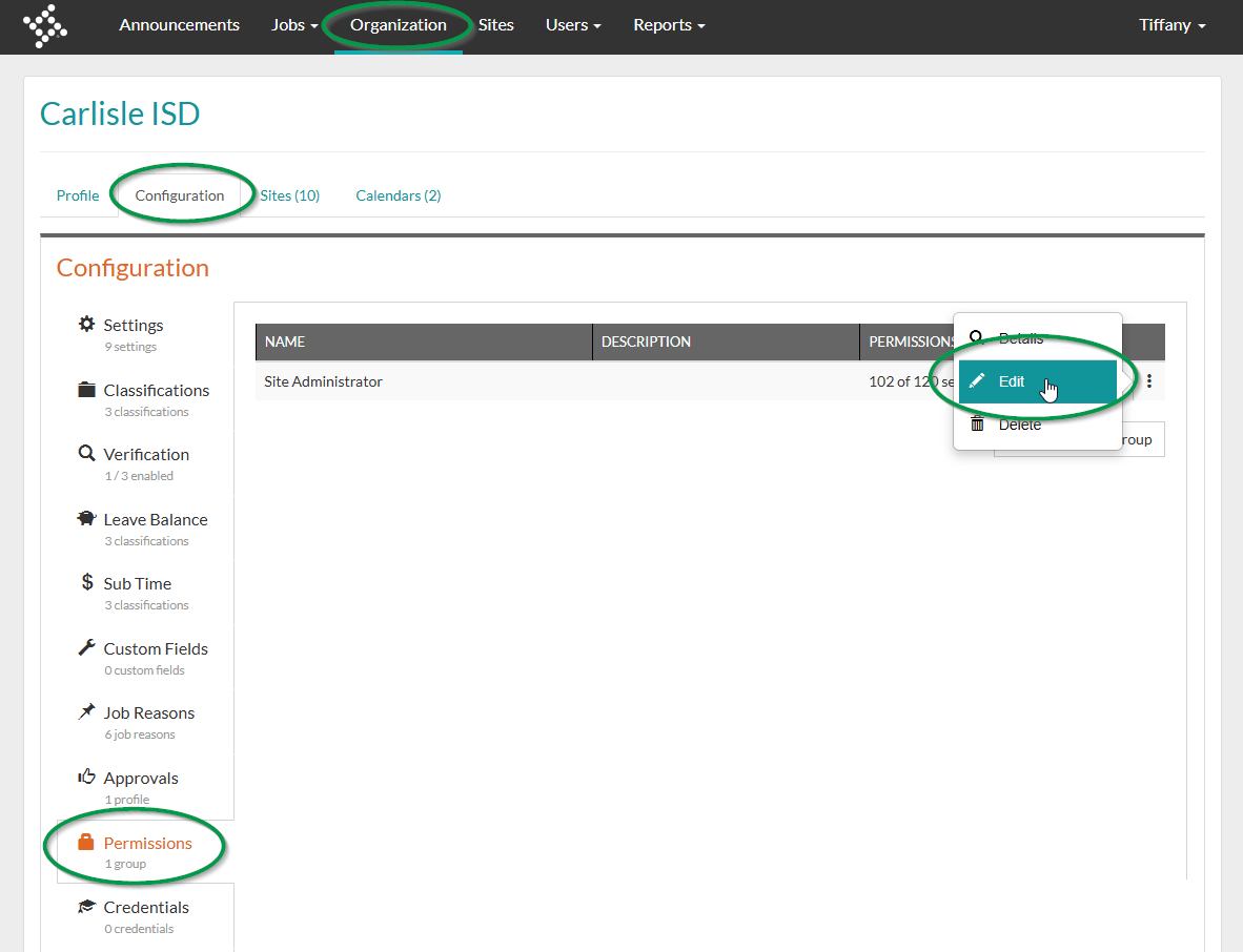 2. To edit an existing Permission Group, navigate to Organization > Configuration > Permissions > click the three dots next to the Permission Group and click Edit.