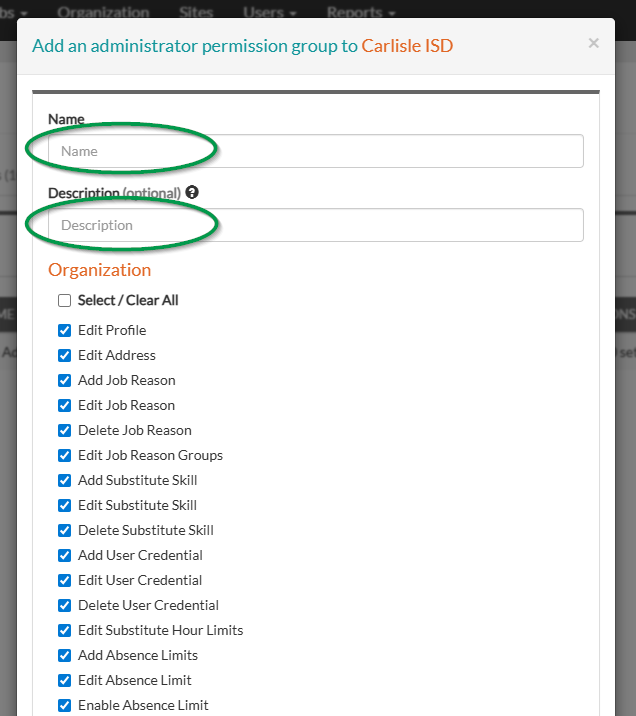 3. When adding a permission group, enter the Name of the Permission Group and optionally enter the Description.