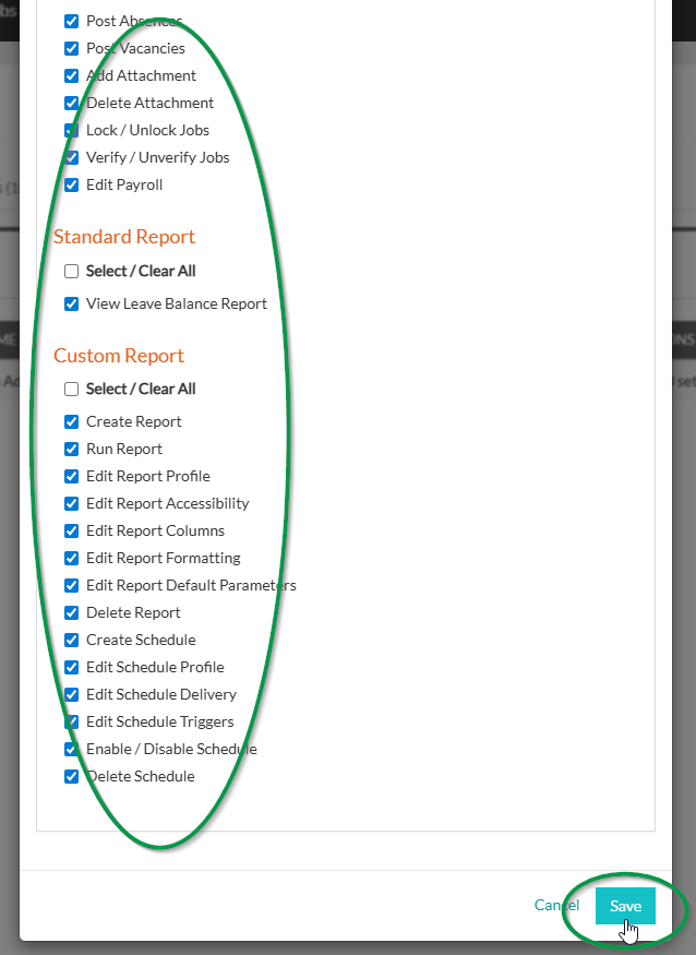 4. Select all applicable permissions for this Permission Group and click Save at the bottom of the list.