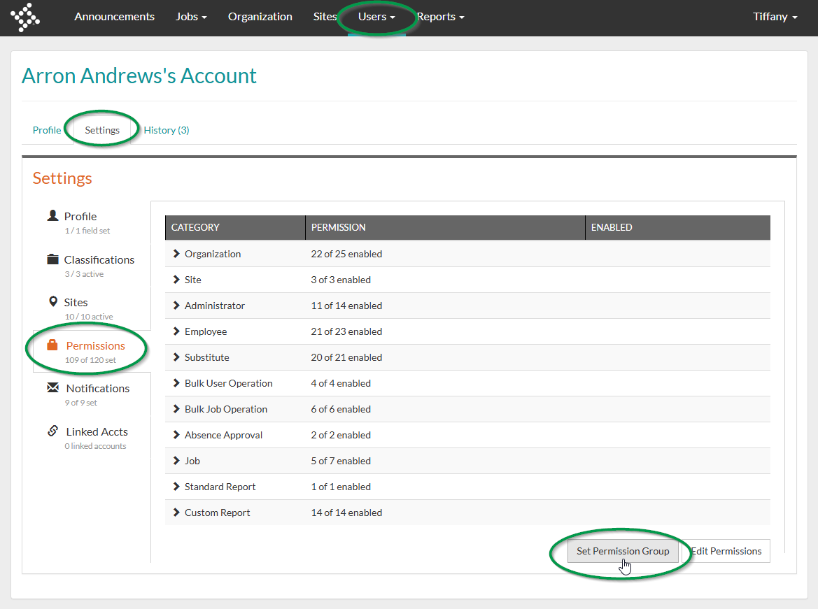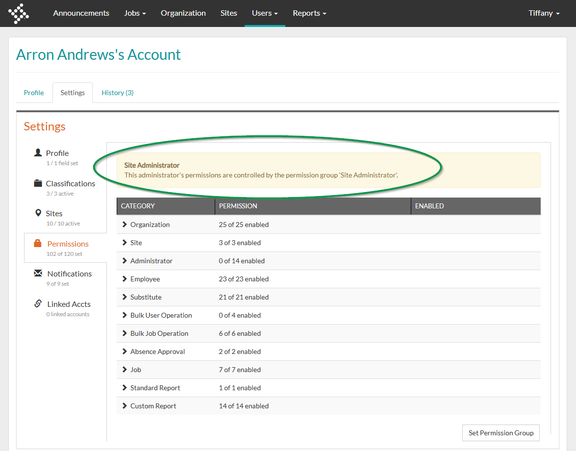 5. Once you have created a Permission Group, it can be assigned to an administrator by navigating to a User > Settings > Permissions > and clicking Set Permission Group.